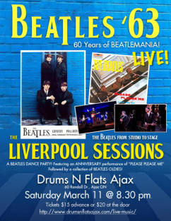 MARCH 11, 2023BEATLES ‘63 - Featuring “Please Please Me” LIVE @ 60!The Liverpool Sessions ‘63Drums N Flats AJAXAjax ONTickets $15 advance or $20 at the doorhttp://www.drumsnflatsajax.com/live-music/